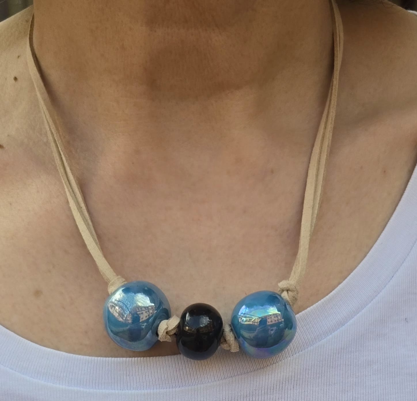 Collar artesanal elaborado con bolas de cerámica que aportan un acabado elegante y distintivo, combinado con angelina para un toque suave y natural. El contraste de materiales genera una pieza equilibrada y única, pensada para destacar como complemento protagonista.